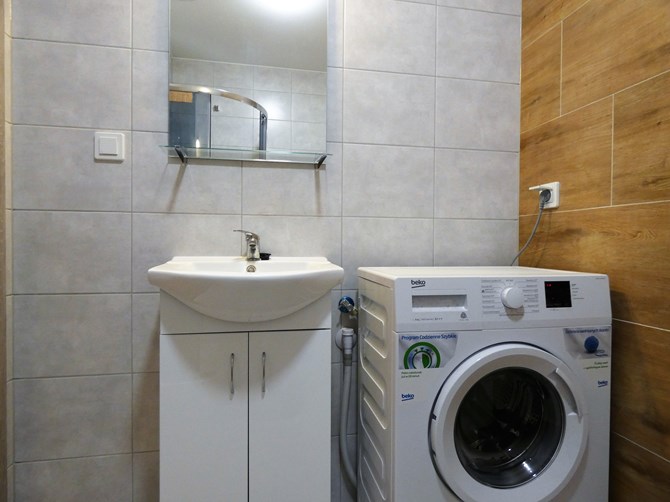 Łazienka: kabina prysznicowa, pralka, umywalka z szafką, lustro, WC.
