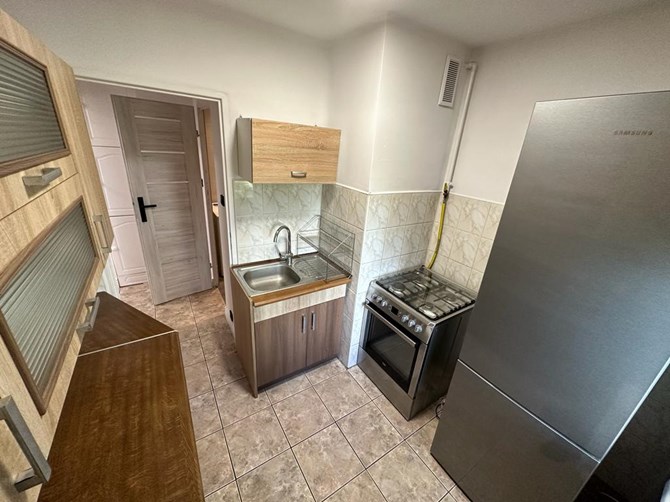 Kuchnia: szafki wiszące i stojące, kuchenka gazowa i piekarnik, zlewozmywak, lodówka.