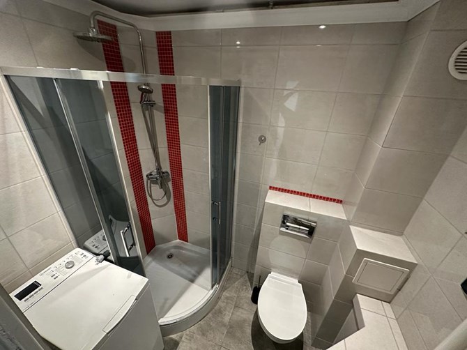 Łazienka z WC: prysznic, umywalka, szafka, lustro, pralka.