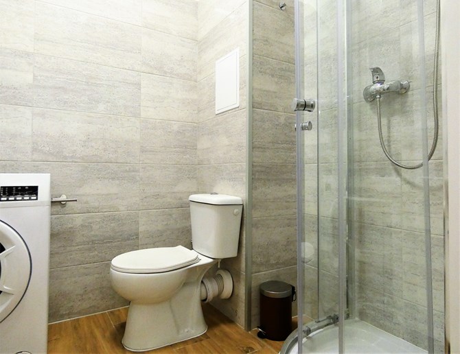 Łazienka (razem z WC) : lustro, umywalka z szafką, kabina prysznicowa, pralka, kaloryfer elektryczny.