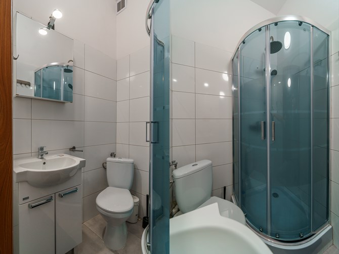 Łazienka: prysznic, WC, umywalka z lustrem.