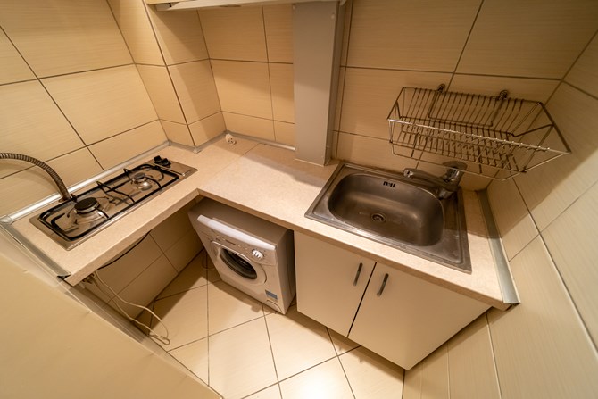 Kuchnia: 2-palnikowa kuchenka gazowa, pralka, zlewozmywak, szafki wiszące i stojące.