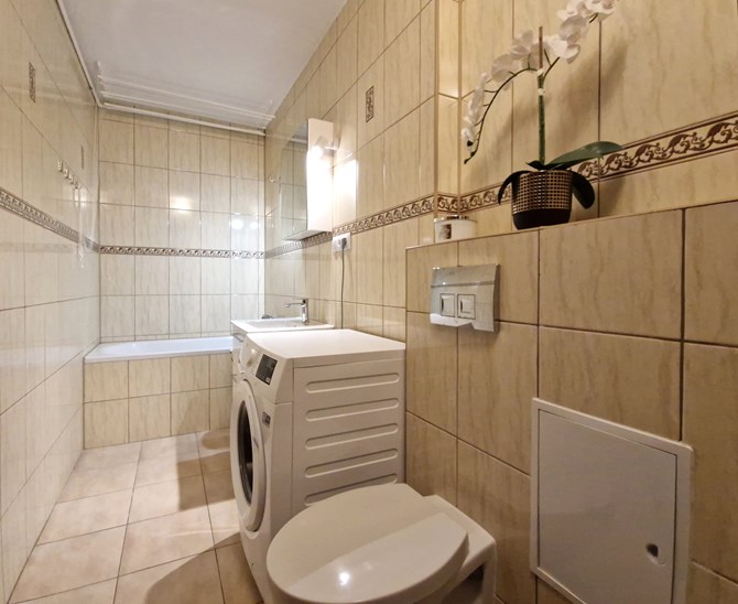 Łazienka (razem z WC): pralka, wanna, umywalka, lustro, szafki.
