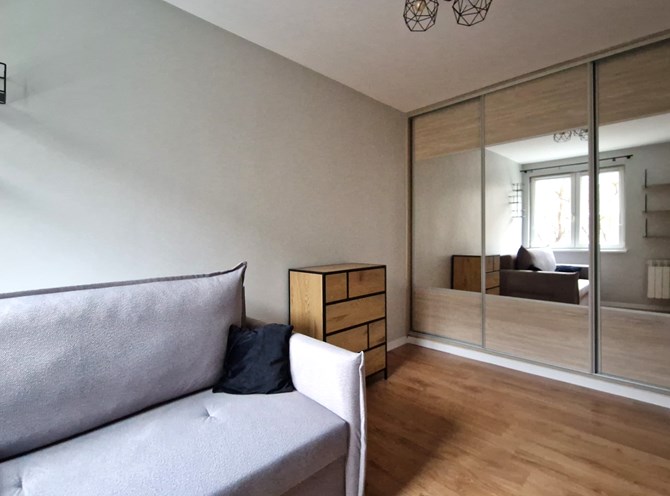 Sypialnia: rozkładana kanapa, szafa, szafki, komoda.