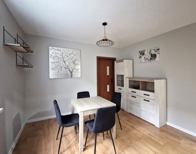 Salon z aneksem: Stół + 4 krzesła, komoda, szafa, lodówko-zamrażarka, zmywarka, piekarnik, okap, zlewozmywak.