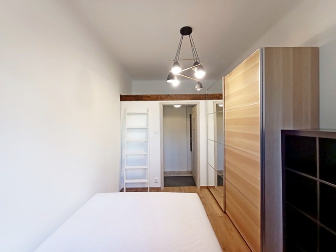 Sypialnia: podwójne łóżko z materacem, regał, szafa typu PAX.