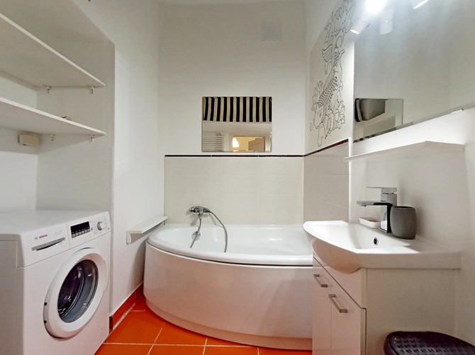 Składa się z salonu z oknami zapewniającymi dużo światła, zwiększającej powierzchnię użytkową sypialni z antresolą, oddzielnej kuchni, łazienki z wanną i pralką oraz przedpokoju.