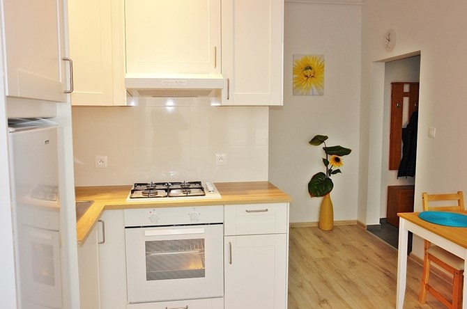 Aneks kuchenny: szafki, płyta gazowa oraz lodówka.