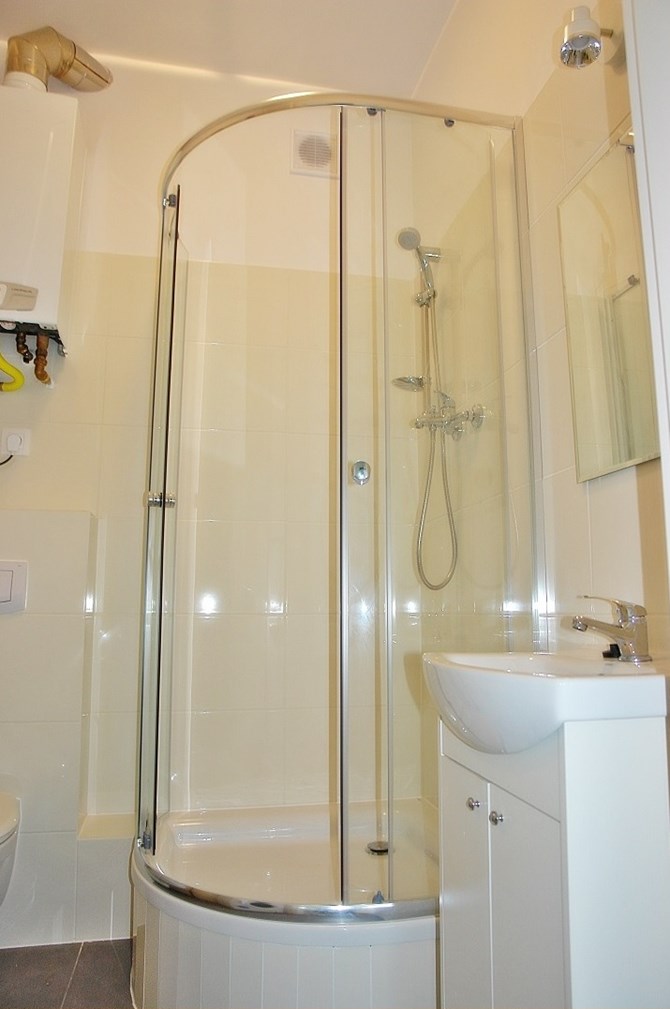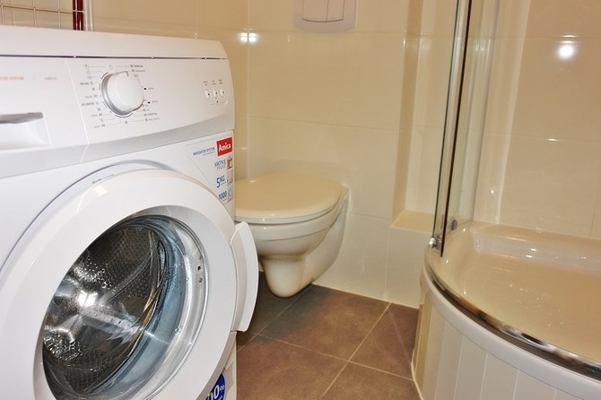 Łazienka: prysznic, WC, umywalka oraz pralka.