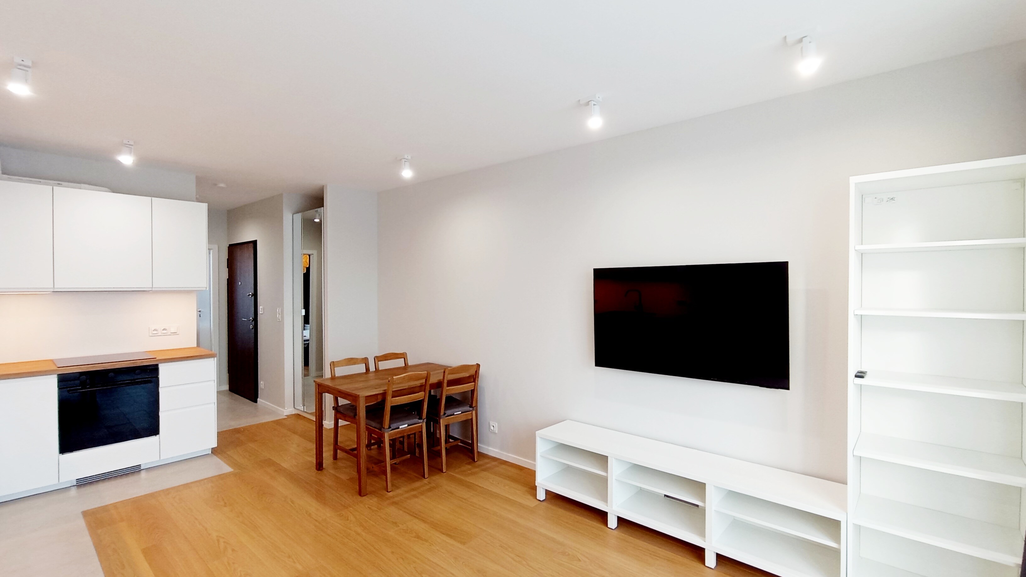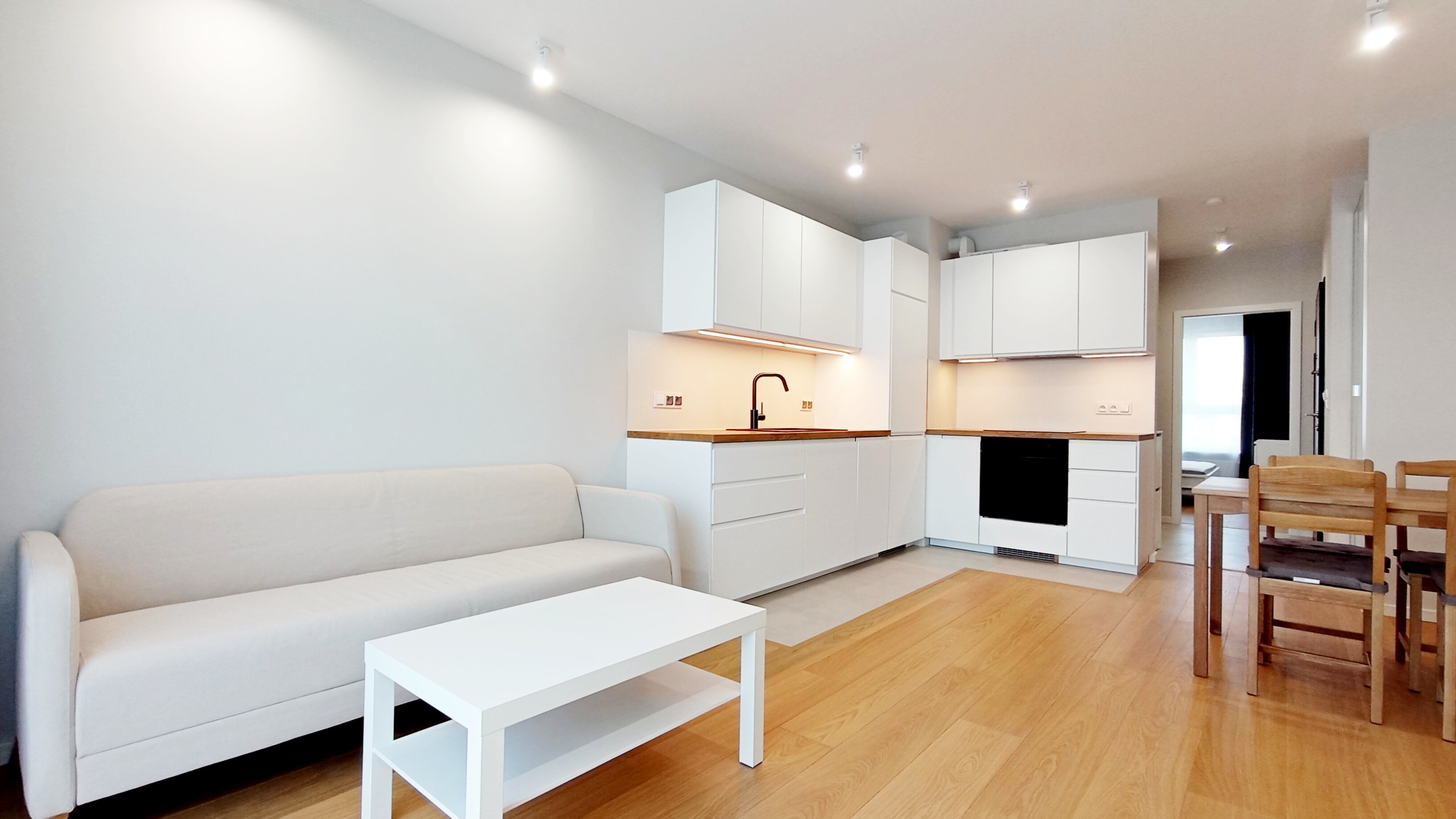 • Salon z aneksem kuchennym i wyjściem na balkon.