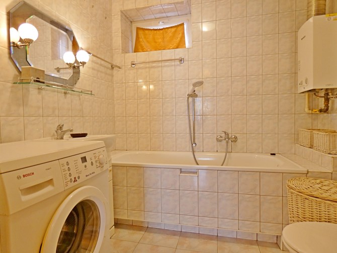 Łazienka: wanna, umywalka, szafka, pralka, WC.