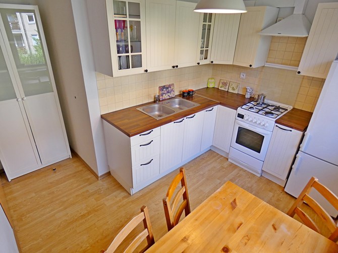 Kuchnia: szafki wiszące i stojące, kuchenka z piekarnikiem, okap, zlew, lodówko-zamrażarka, stół z krzesłami, witryna.