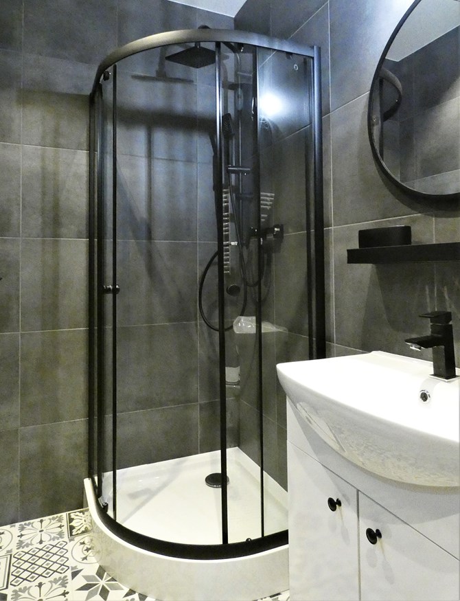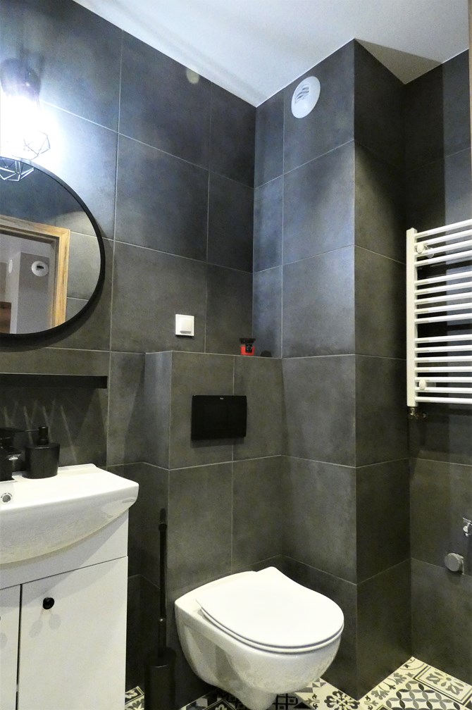 Łazienka z WC: lustro z półką, kabina prysznicowa, pralka.