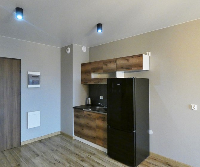 Pokój z aneksem: szafki, lodówka, dwupalnikowa płyta grzewcza, siedzisko.