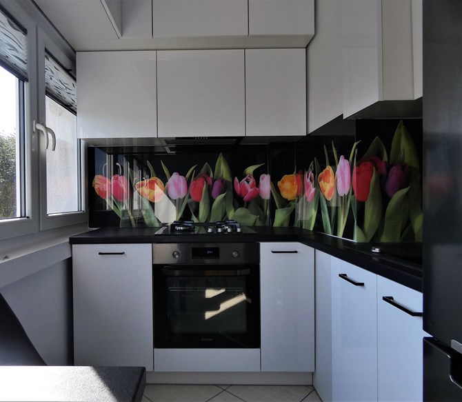 Kuchnia: szafki, lodówka, zmywarka, piekarnik, okap, kuchenka czteropalnikowa, zlewozmywak, stół, krzesła.