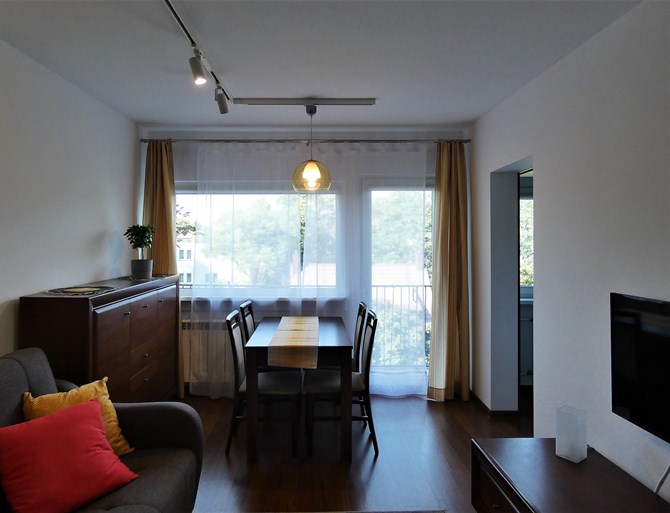 Pokój: rozkładana sofa, telewizor, 2 komody, 2 szafy, stół, krzesła.