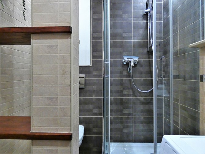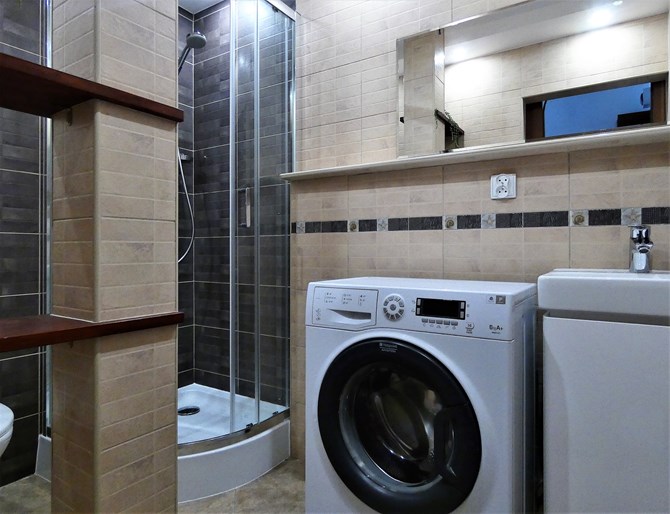 Łazienka (razem z WC): lustro, umywalka, szafka, pralka, kabina prysznicowa.