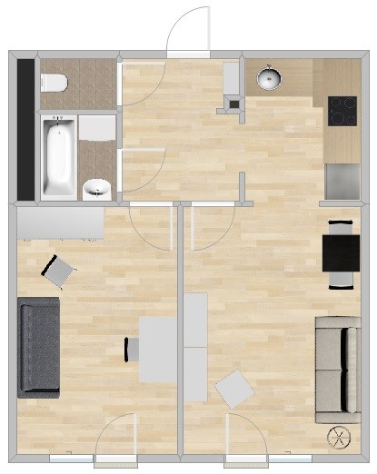 *Składa się z dwóch pokoi, korytarza, łazienki, osobnego WC połączonego z aneksem kuchennym