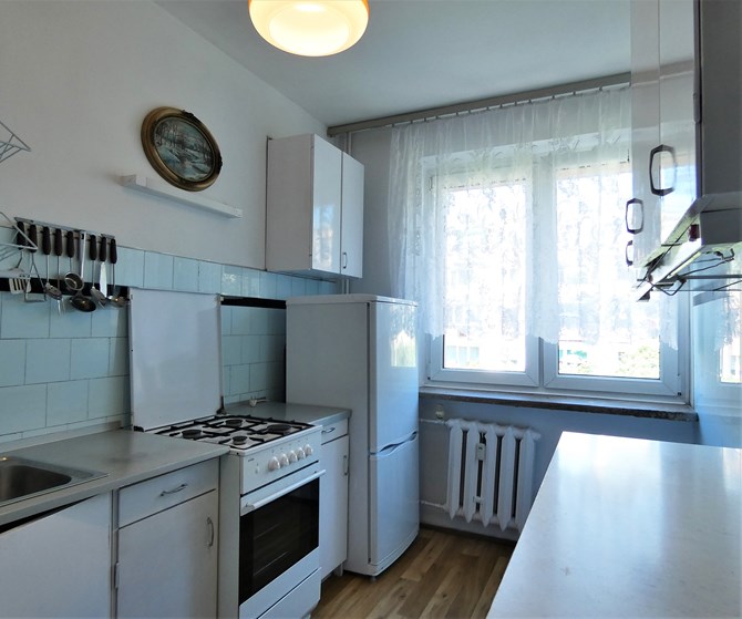 Kuchnia: meble kuchenne, zlewozmywak, piekarnik, czteropalnikowa kuchenka gazowa, lodówka.