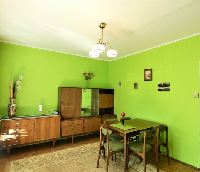 Pokój 1: stół z krzesłami, komoda, fotel.