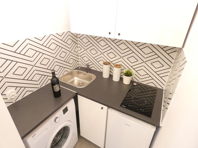 Aneks kuchenny: lodówko-zamrażarka, płyta ceramiczna dwupolowa, szafki kuchenne, pralka.