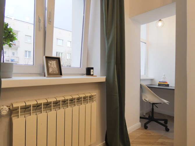Wnęka z oknem do pracy: biurko, krzesło obrotowe.