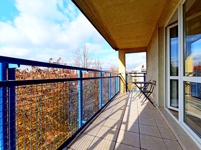 Z salonu wyjście na duży balkon z widokiem na zieleń.