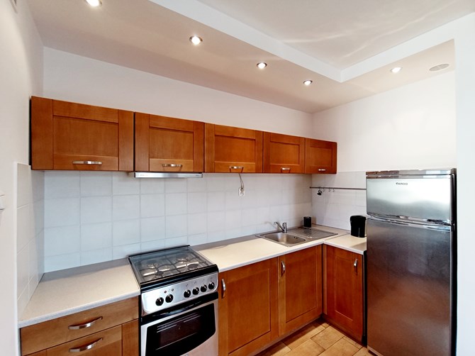 Kuchnia: lodówko-zamrażarka, okap, 4-palnikowa płyta gazowa, czajnik elektryczny, piekarnik, zlewozmywak z ociekaczem.