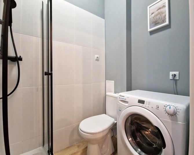 Łazienka z WC: kabina prysznicowa, lustro z umywalką, pralka, szafka.