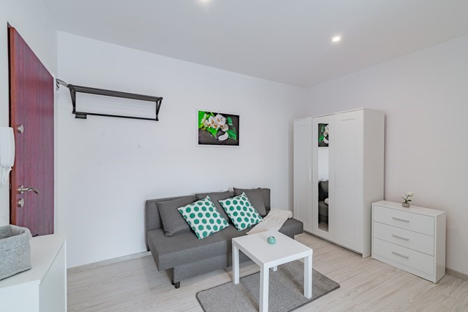 Pokój wyposażony w rozkładaną kanapę, szafę, komodę oraz stolik kawowy.