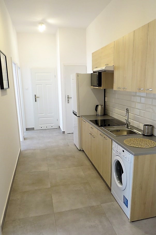 Aneks kuchenny: szafki wiszące i stojące, okap, płyta elektryczna, lodówka z zamrażarką, pralka.