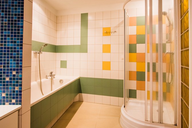 Łazienka: wanna, umywalka, kabina prysznicowa, WC.