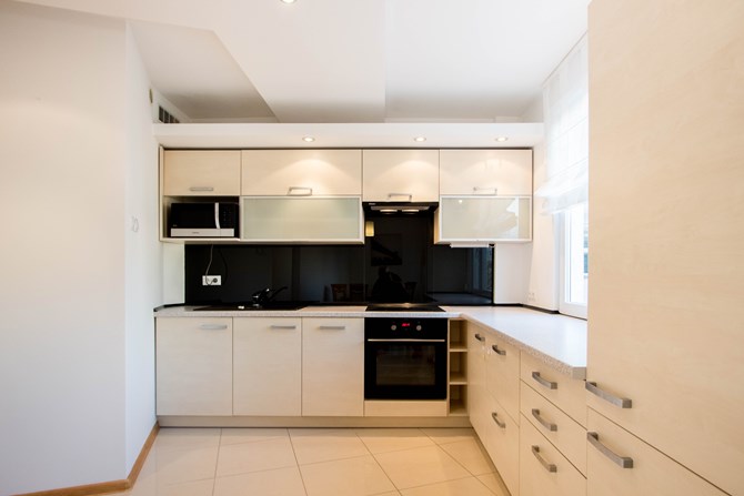 Kuchnia: szafki, zlewozmywak, płyta grzewcza, piekarnik, zmywarka, lodówka, mikrofalówka.
