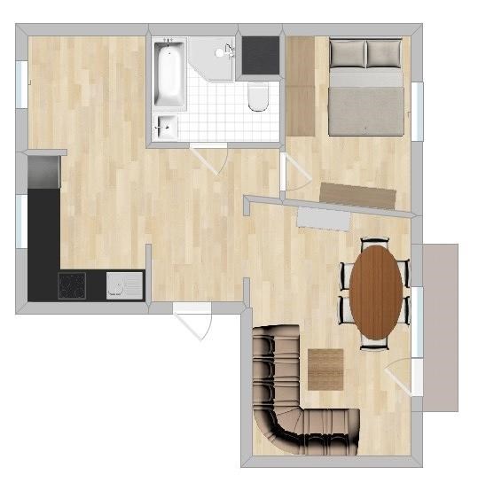 Lokal składa się z salonu, sypialni, dużej i widnej kuchni oraz bardzo przestronnej, ciekawie zaaranżowanej łazienki.