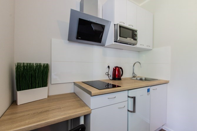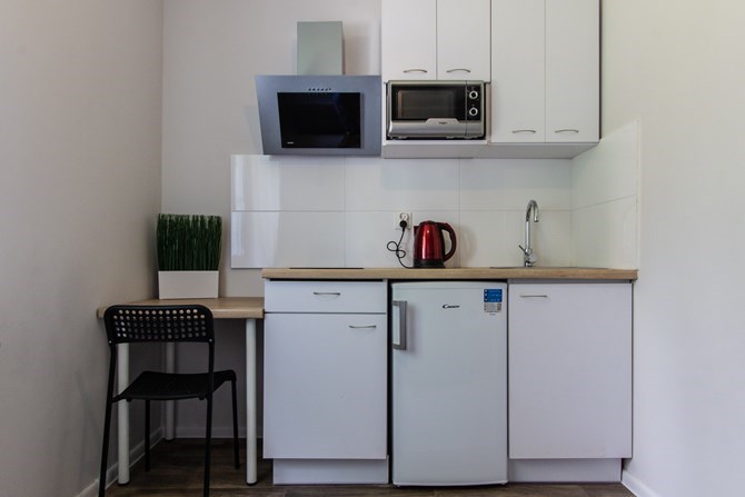 Aneks kuchenny: lodówka, zlew, okap, czajnik, ceramiczna płyta dwupalnikowa, piekarnik.