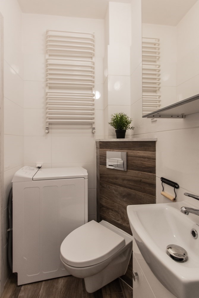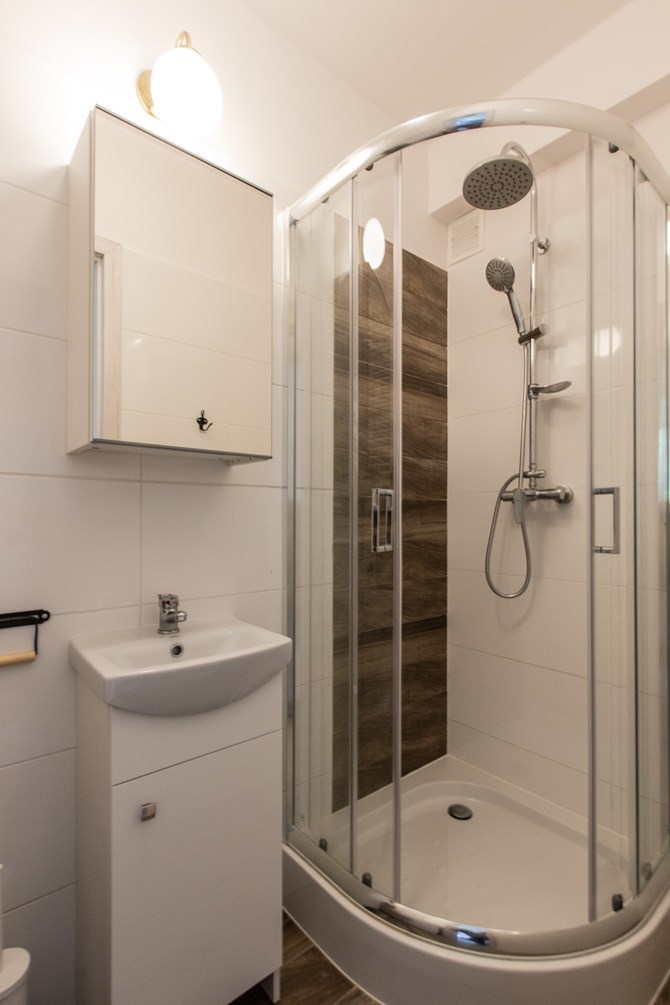Łazienka: kabina prysznicowa, toaleta, pralka, umywalka z lustrem.