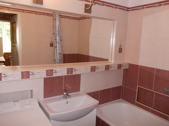 Łazienka: wanna, umywalka z szafką oraz pralka. WC znajduje się w oddzielnym pomieszczeniu.