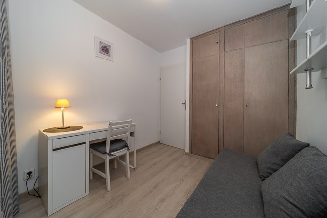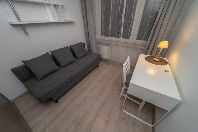 Pokój: rozkładana kanapa, szafa w zabudowie, biurko, krzesło, lampka.