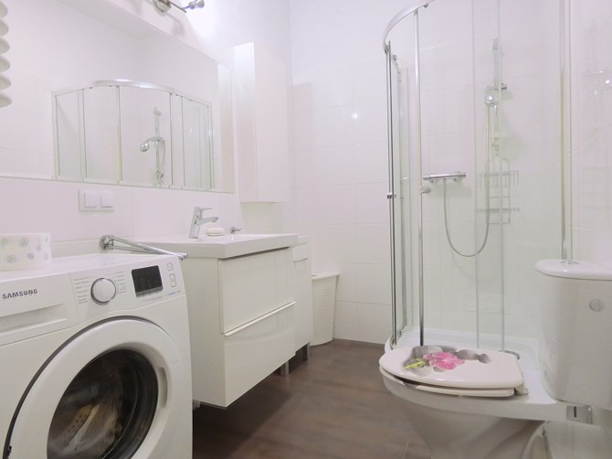 Łazienka: pralka, umywalka, lustro, prysznic, szafki, WC.