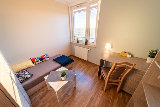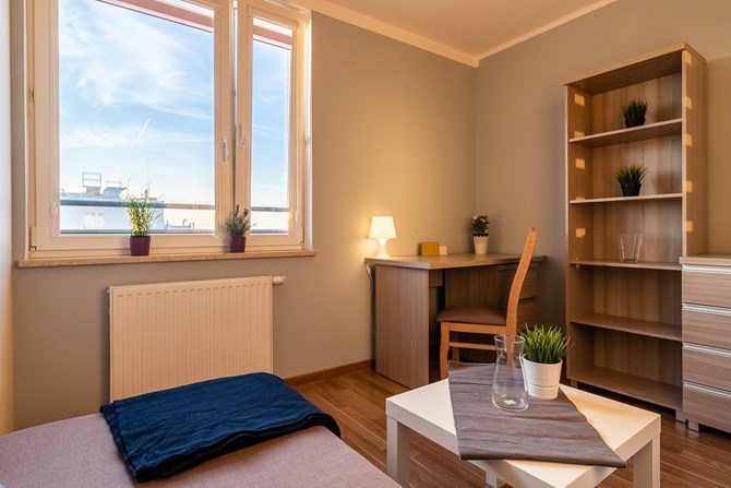 Do wynajęcia jasny pokój w nowoczesnym, pięciopokojowym mieszkaniu z zamykanymi na klucz pokojami przy ul. Osiedle Avia 1 w Krakowie, z pięknym widokiem na miasto, miejskim ogrzewaniem oraz Internetem w cenie, idealny dla studenta dzięki bliskości uczelni i dobrej komunikacji.