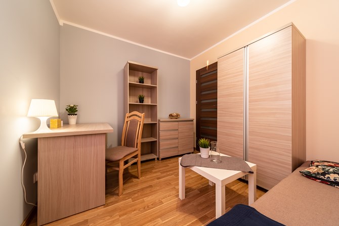 Pokój: pojedyncze łóżko, pojemna szafa na ubrania, komoda, biurko, szafka z półkami na książki.