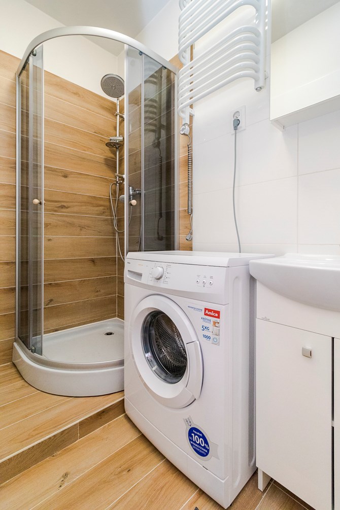 Łazienka z WC: kabina prysznicowa, umywalka, pralka