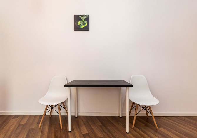 Kuchnia: szafki kuchenne, piec elektryczny 4-palniki z piekarnikiem, lodówka, okap, stół, krzesła