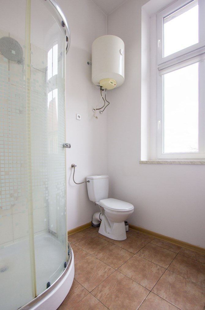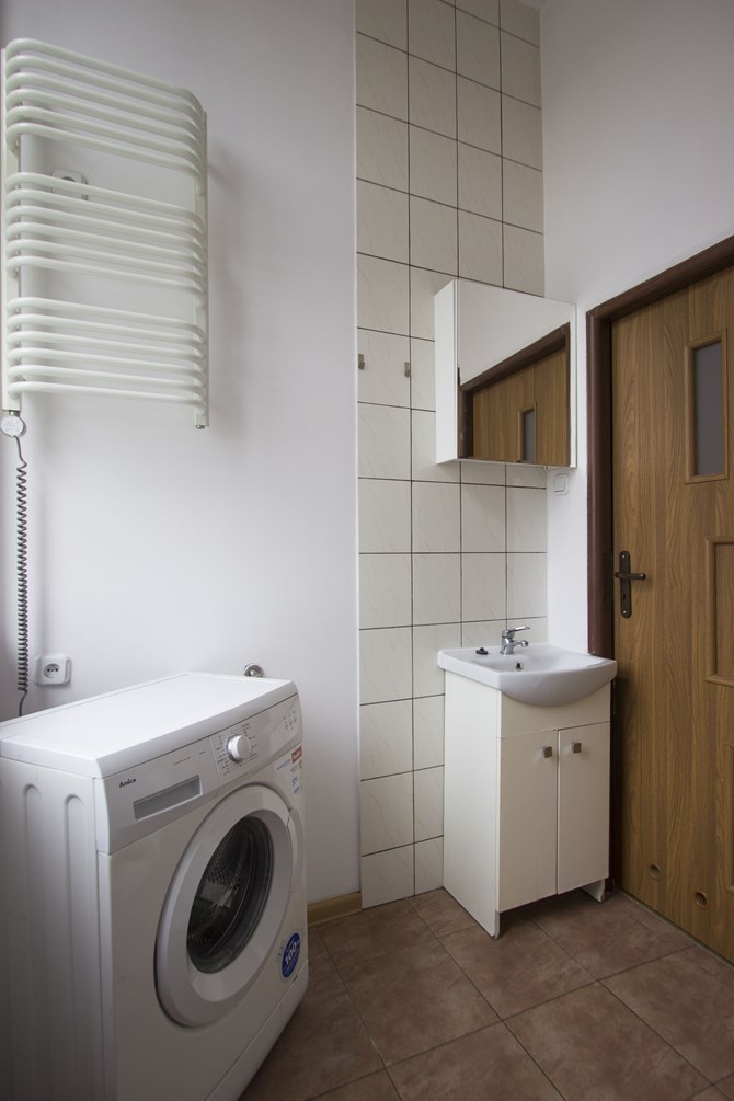 Łazienka z WC: kabina prysznicowa, umywalka, pralka.