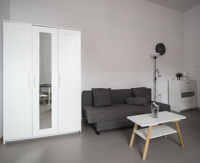 Pokój: szafa, komoda, wersalka, stolik kawowy.