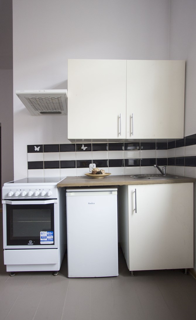 Kuchnia: szafki, piec 4-palnikowy z piekarnikiem, okap, lodówka, stół, krzesła.