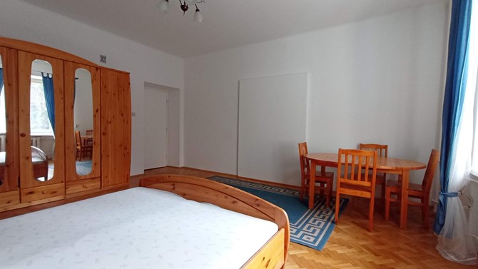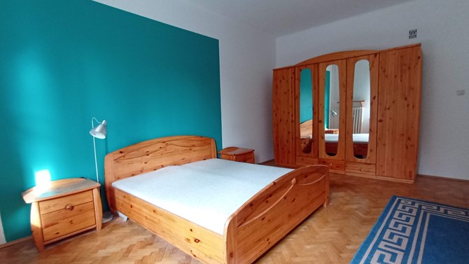 Pokój: duże łóżko dwuosobowe, dwie szafki nocne, bardzo duża szafa, stół i 6 krzeseł.