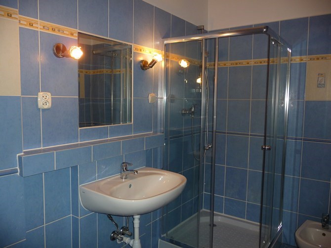 Łazienka: umywalka, kabina prysznicowa, WC, bidet.