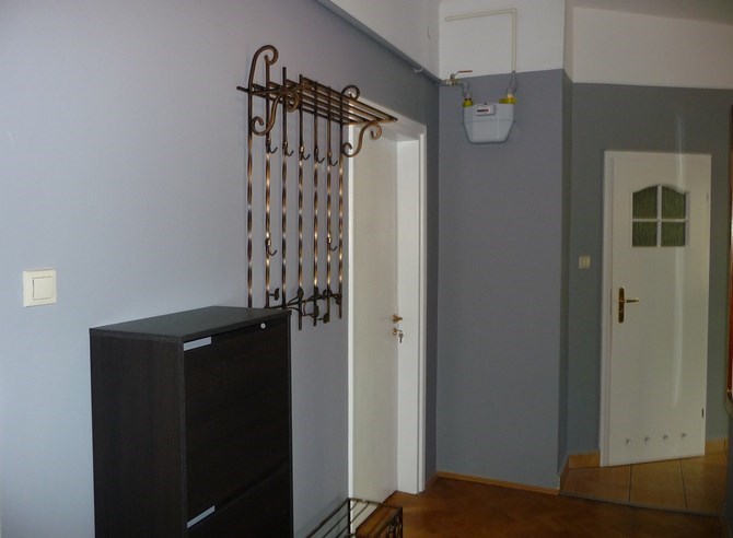 Przedpokój: szafka na buty, wieszak, stołek.