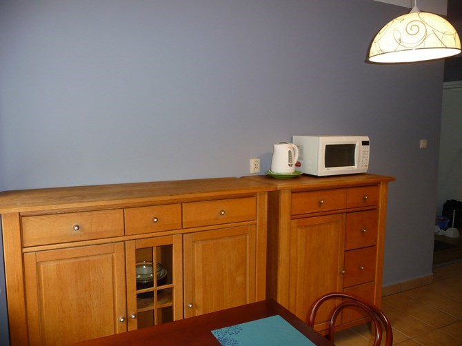 Kuchnia: szafki kuchenne wiszące i stojące, kredens x2, stół, dwa krzesła, zlew, płyta gazowa, lodówka, pralka, mikrofalówka, czajnik elektryczny.